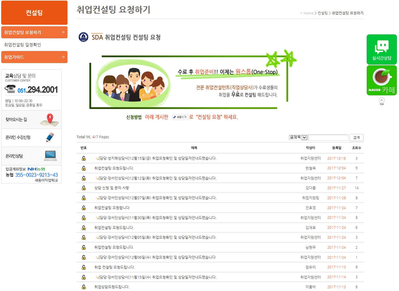 | 검토결과 | 본교는 수료생들을 위해 취업지원센터를 별도 운영하고 있으며 1:1로 취업컨설팅을 실시하고 있습니다. 홈페이지 '컨설팅'게시판을 통해서 신청해주시면 취업의 A부터 Z까지 도와드리도록 하겠습니다. |