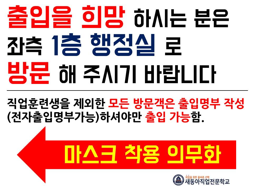 정부의 코로나19확산방지 및 예방정책에 발맞춰 새동아직업전문학교 학교생활수칙 및 방역수칙을 공지해드립니다.