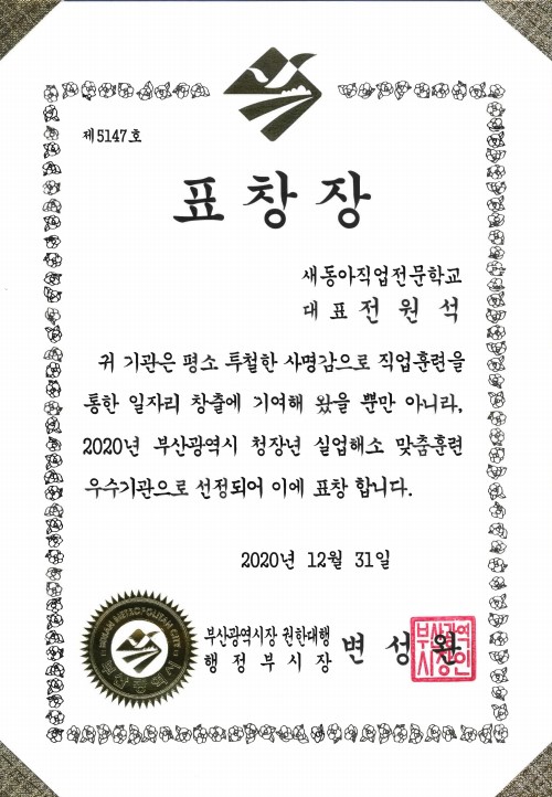 새동아직업전문학교가 2020년 부산광역시 일자리창출 기여 공로로 부산시장표창을 수상하였습니다.