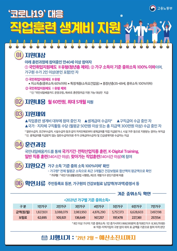 코로나19 확산으로 생계가 어려운 중·장년층에게 안정적인 훈련 참여를 위한 생계비 지원이 아래와 같이 확대되었음을 알려드리오니