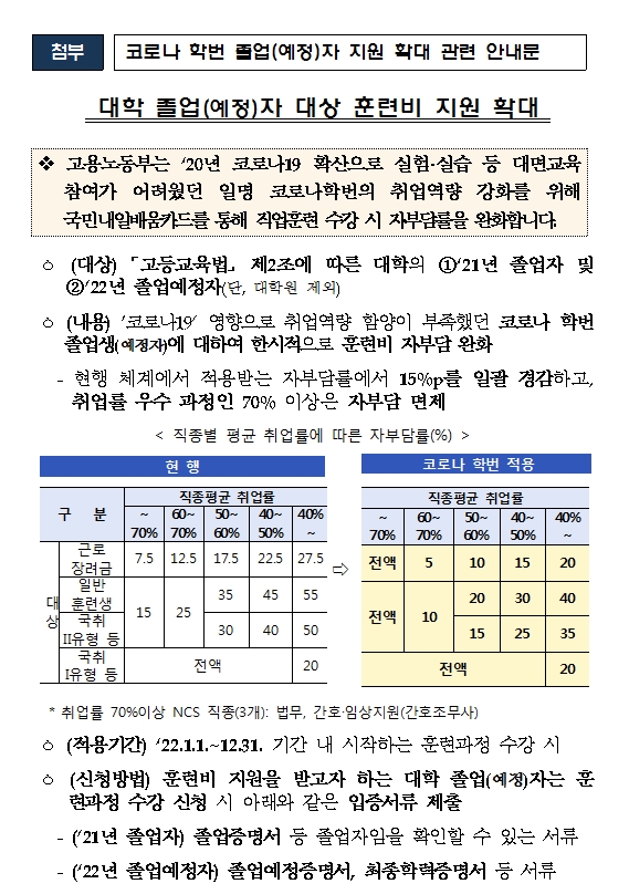 대학 졸업(예정)자 대상 훈련비 지원 확대(2022~ )